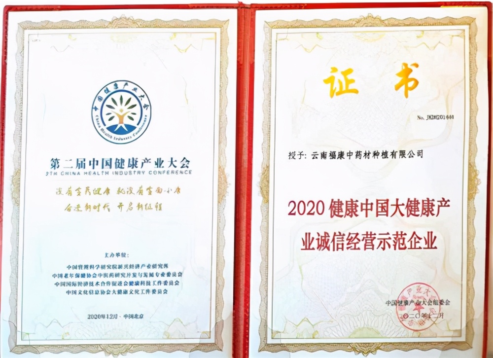 云南福康中药材种植有限公司董事长林豪杰受邀参加了本届大会。作为一家专注于优良品种的育苗、种植、收购、加工、销售于一体的综合性企业,在本次大会上,公司被组委会组织开展的“2020健康中国品牌盛典”评为2020健康中国大健康产业诚信经营示范企业,这是对公司多年开奉行“诚信为本、消费者至上”的理念的认可和鞭策。同时,公司董事长林豪杰还被中国健康产业联盟聘任为副主席,参与联盟的建设。